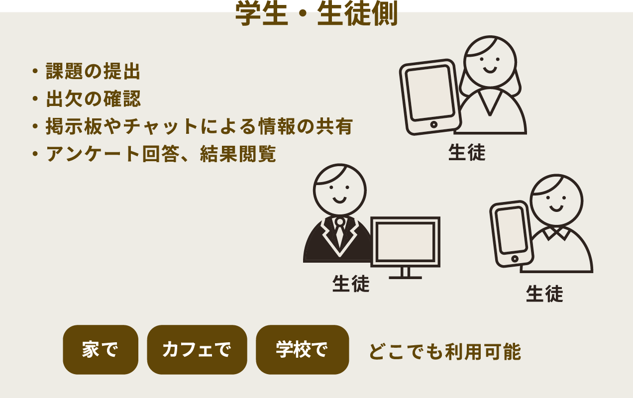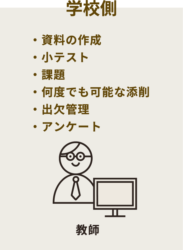 学校内での利用はもちろん、自宅学習、両者のブレンデッド、反転学習など多様な学習形態に対応したeラーニングシステム