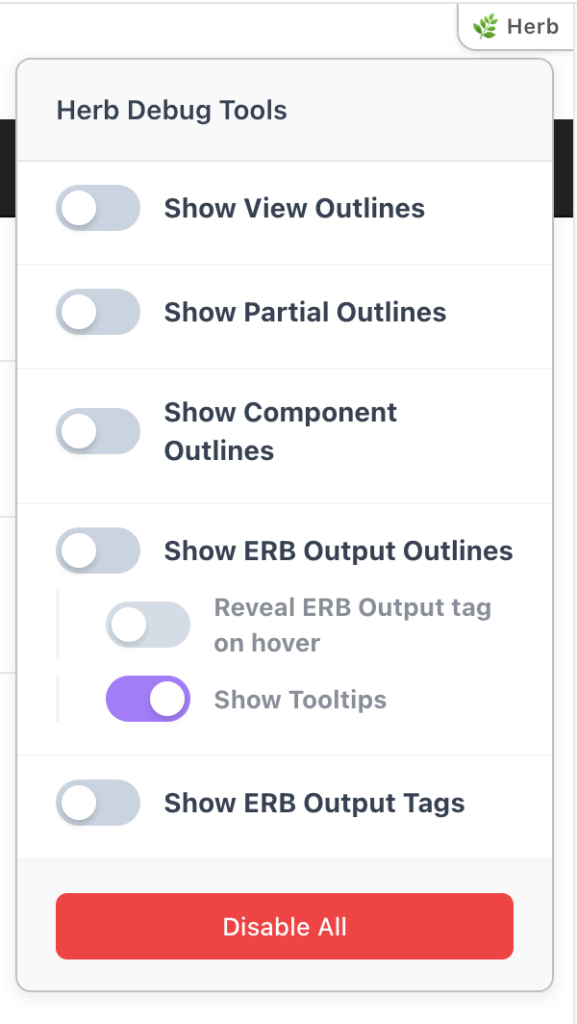 実は左上の部分に Herb というボタンが追加されています。この Herb ボタンが Debug Tools の入口です。