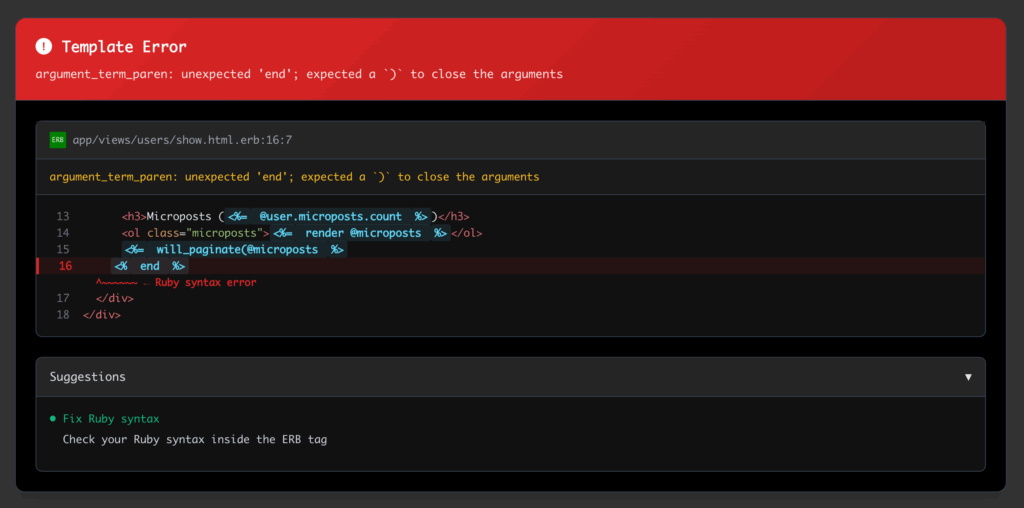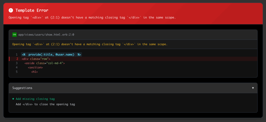 デバッグモードを有効にしていると便利なのがエラー表示です。タグの不一致や ERB の文法エラーが見つかった際に ReActionView が専用のエラーページを表示します。