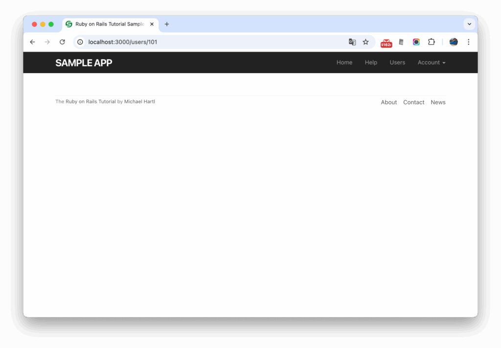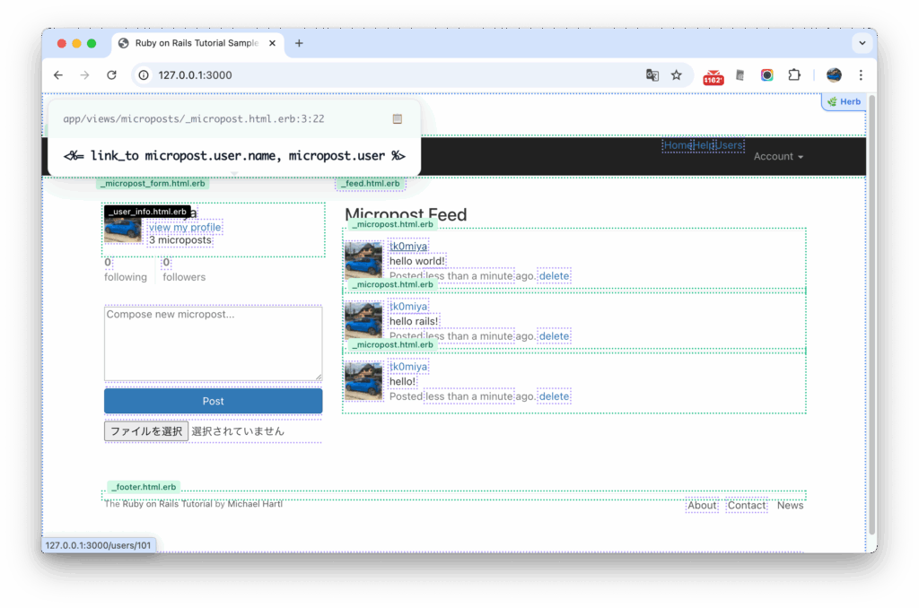 ここではサンプルとして Rails チュートリアルのサンプルアプリケーション を利用します (yasslab さんに感謝です)。development モードで (デバッグモードを有効にした状態で) Rails アプリケーションにブラウザでアクセスしてみます。