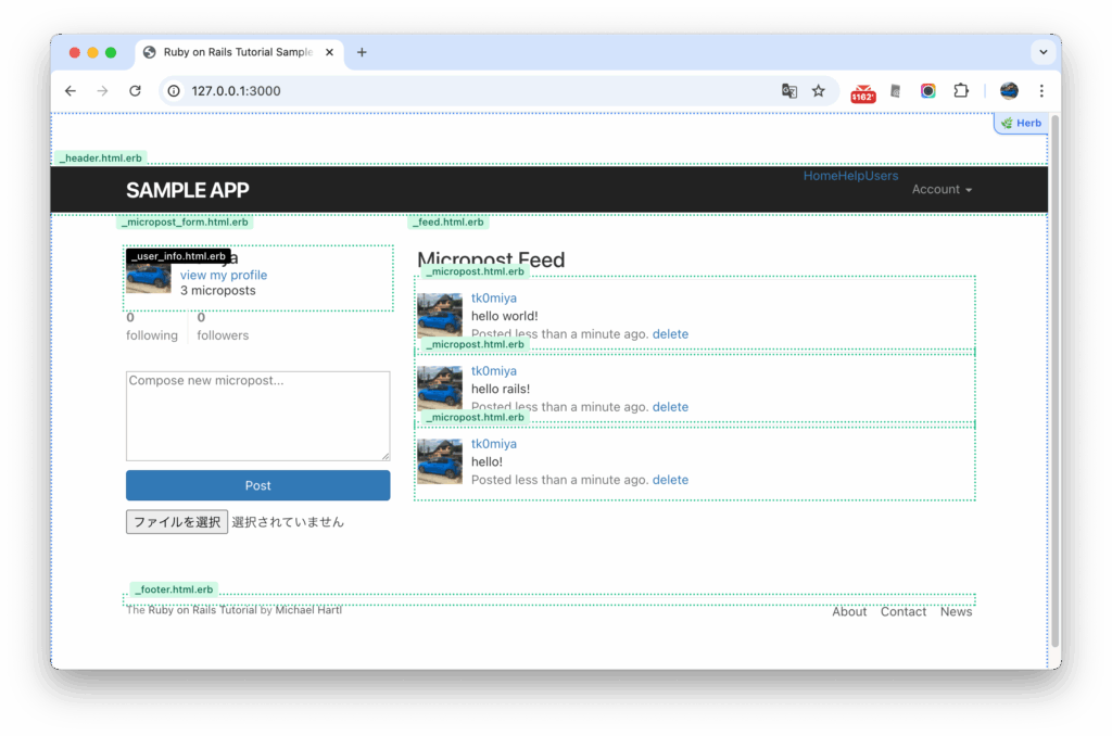 Rails チュートリアルアプリが表示されますが、ひとつだけ違いがあります。わかりますか?